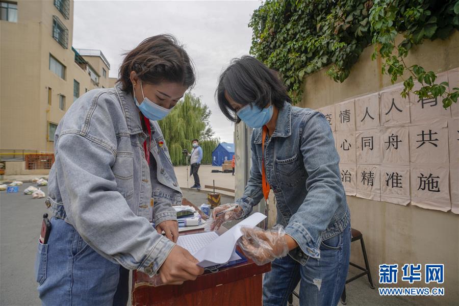 盛筱榆(左)在空中花园小区的体温检测台了解工作情况(8月26日摄)。 新华社记者 赵戈 摄