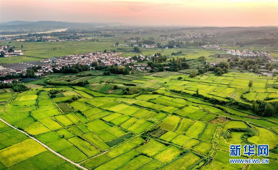 夕阳下的洋县戚氏街道的稻田(8月28日摄,无人机照片)。 新华社记者 陶明 摄