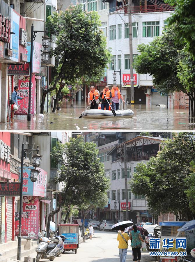拼版照片:上图为8月18日,在甘肃省陇南市文县碧口镇,救援人员在搜寻受灾群众;下图为洪水退去后的碧口镇街道(8月28日摄)。