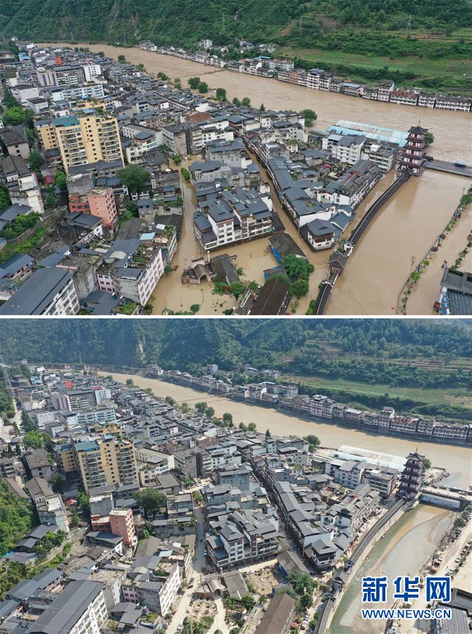 拼版照片:上图为8月18日拍摄的严重内涝的甘肃省陇南市文县碧口镇(无人机照片);下图8月28日拍摄的洪水退去后的碧口镇(无人机照片)。新华社记者 杜哲宇 摄