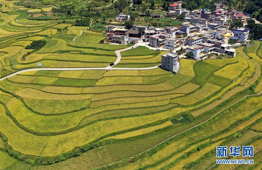 这是8月28日拍摄的贵州省铜仁市玉屏侗族自治县亚鱼乡郭家湾村梯田景色(无人机照片)。 新华社发(欧秀灯 摄)
