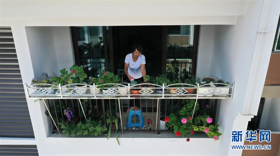 8月27日,在李家溪易地扶贫搬迁安置点,已是小区清洁工的搬迁户周玉兰,利用午休时间回家打理阳台上的花草(无人机照片)。 重庆市黔江区城南街道李家溪易地扶贫搬迁安置点是深度贫困乡镇集中安置点。为让搬迁户“搬得出、住得下、能致富”,安置点完善了医院、学校等一系列生活配套设施。同时,该区还在安置点投资兴建了食用菌产业园,引进了服装厂等企业,帮助搬迁户在家门口就业,实现脱贫增收。 新华社发(杨敏 摄)