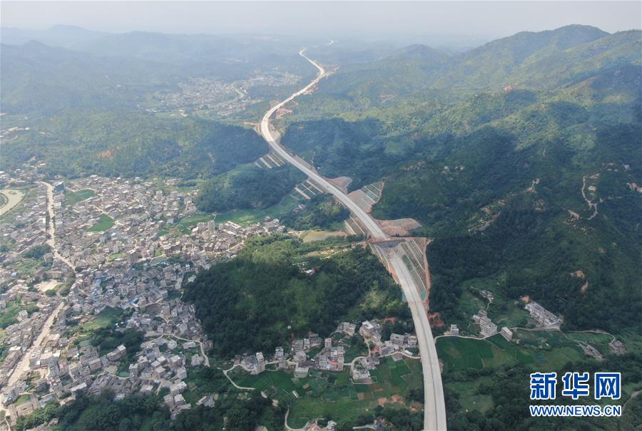 这是广东梅州山间的大丰华高速公路(8月29日摄,无人机照片)。 目前,广东大丰华(大埔-丰顺-五华)高速公路各项施工进展顺利,由中铁十二局集团负责施工的大丰华高速控制性工程鸿图特长隧道正在加紧掘进施工。 新华社记者 邓华 摄