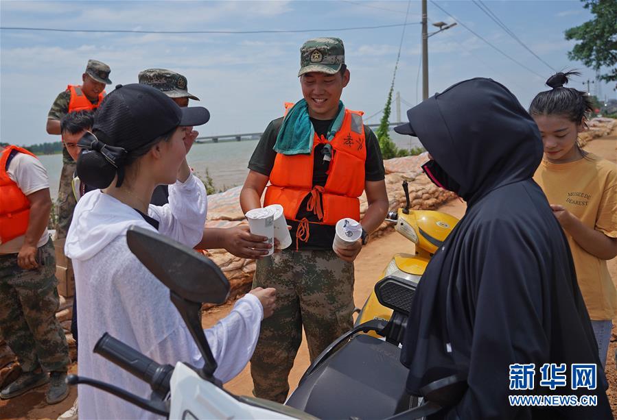 在江西省鄱阳县昌江圩堤上,县城的居民给老兵们送来饮料(7月18日摄)。 新华社记者 万象 摄