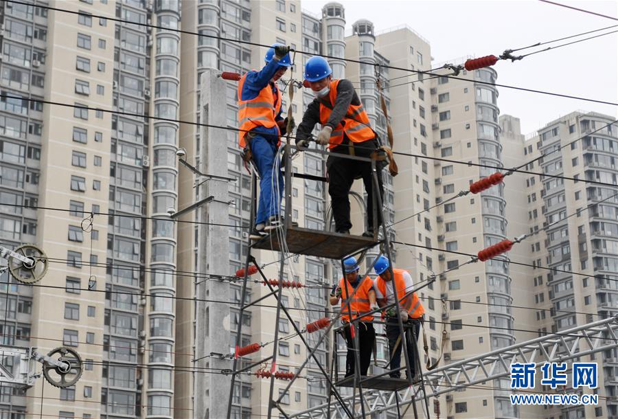8月30日,中铁六局的施工人员在拨线作业现场施工。 当日,丰台站站前过渡工程京沪线、京广线拨接施工顺利进行,京沪线、京广线普速铁路正式拨入新建北京丰台站内。线路拨接完成后,旧线路将进行拆除,开始进行丰台站北侧站房、旅客通道、行包地道等结构施工,为2021年底开通运营提供坚实保障。 新华社记者 张晨霖 摄