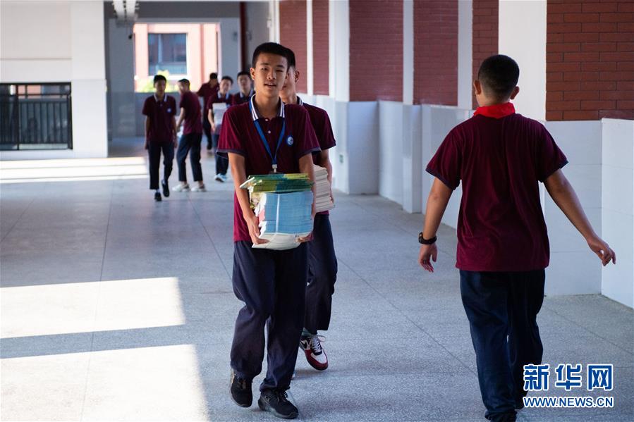 8月31日,长沙市浏阳市道吾中学的学生在搬运新学期教材。 当日,在做好疫情防控工作的前提下,长沙市各区县(市)的普通中小学正式开学。 新华社记者 陈思汗 摄