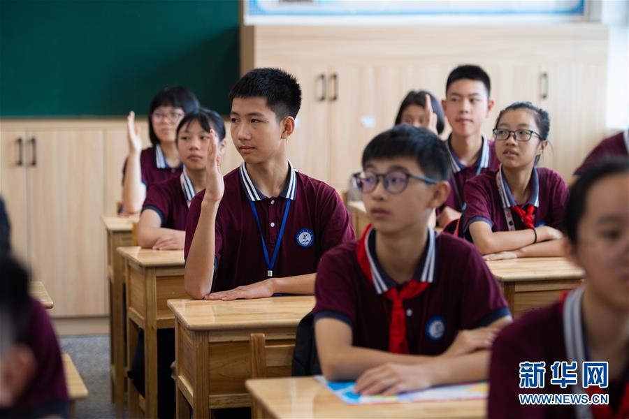 8月31日,长沙市浏阳市道吾中学的学生在课堂上举手示意回答问题。 当日,在做好疫情防控工作的前提下,长沙市各区县(市)的普通中小学正式开学。 新华社记者 陈思汗 摄