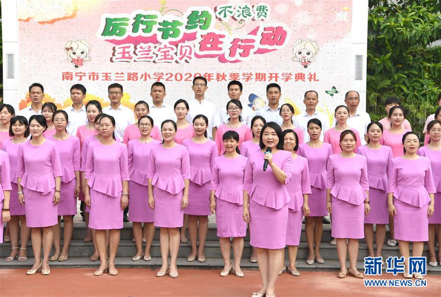 8月31日,南宁市玉兰路小学老师在开学典礼上宣读教师誓言。 当日,广西南宁市中小学正式开学。孩子们走进校园,开始新学期学习生活。 新华社记者 周华 摄