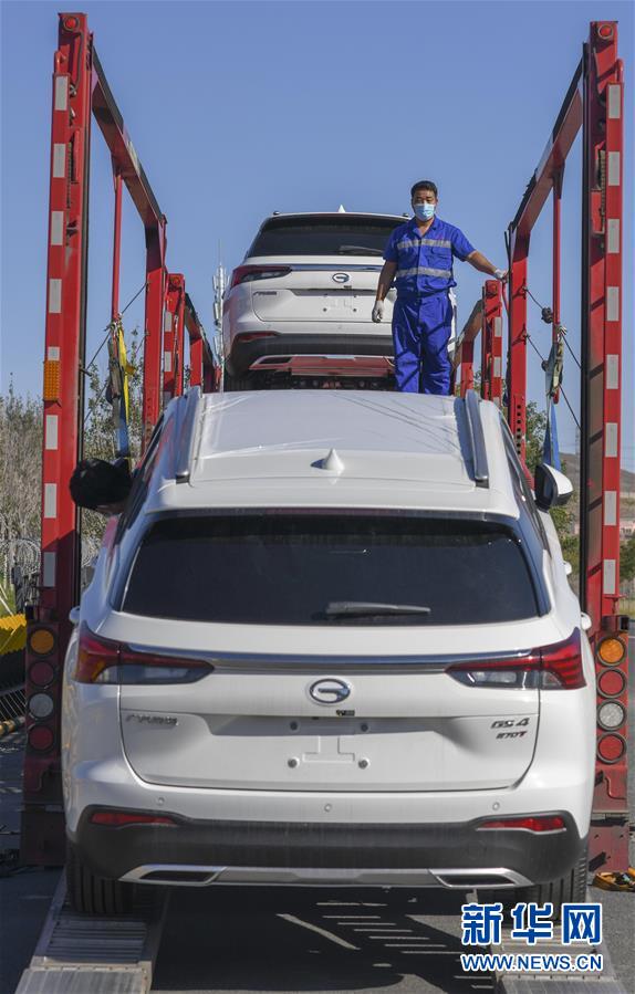 8月31日,在广汽乘用车新疆分公司,广汽传祺轿运车承运商工作人员将汽车开到轿运车上。新华社记者 赵戈 摄