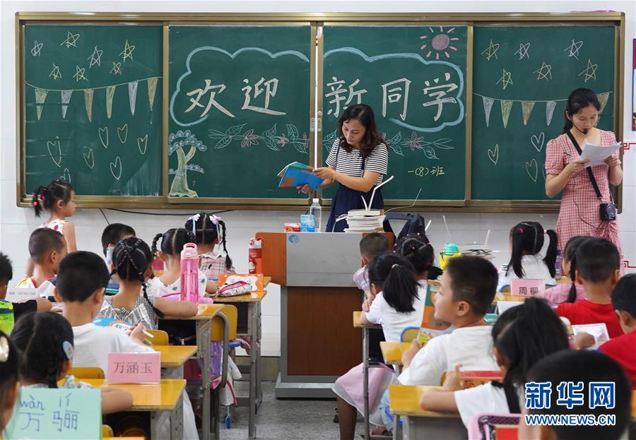 9月1日,在南昌三中高新校区(小学部),老师给小学一年级新生发放教材。 当日,江西南昌市中小学迎来新学期。各校采取错峰入校、体温检测、分散就餐等措施,做好常态化防控。 新华社记者 万象 摄