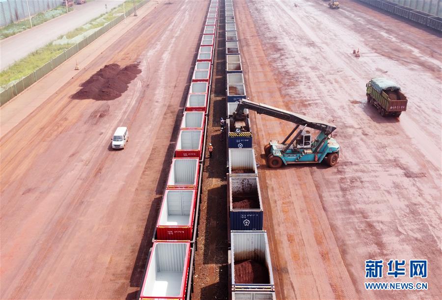 在天津港装车线上,工作人员操作设备将散装货物装至集装箱内(8月31日摄,无人机照片)。天津港积极调整港口集疏运方式,以建设“公转铁+散改集”双示范港口为载体,着力推进散货进箱,提高铁路运输规模。新华社发(赵子硕摄)