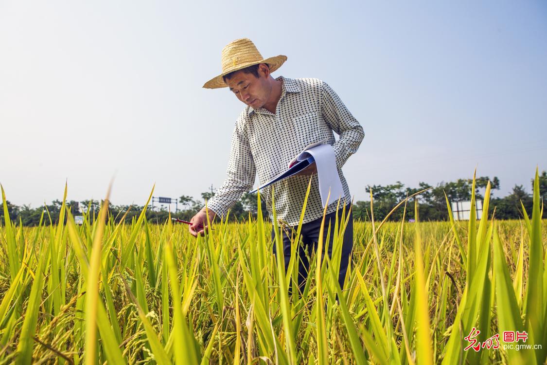 2020年9月1日,科技人员在湖南省湘西土家族苗族自治州龙山县石羔街道干比社区试验田里观察和记录水稻成熟期的生长状况。这次进行的水稻栽种试验是武陵山区(国家)水稻新品种区域及生产试验、湖南省主要农作物(中稻)区域试验、湖南杂交水稻研究中心水稻新品种品比试验等试验,属湖南省水稻省级品种区域试验,约300个水稻品种。(曾祥辉摄/光明图片)