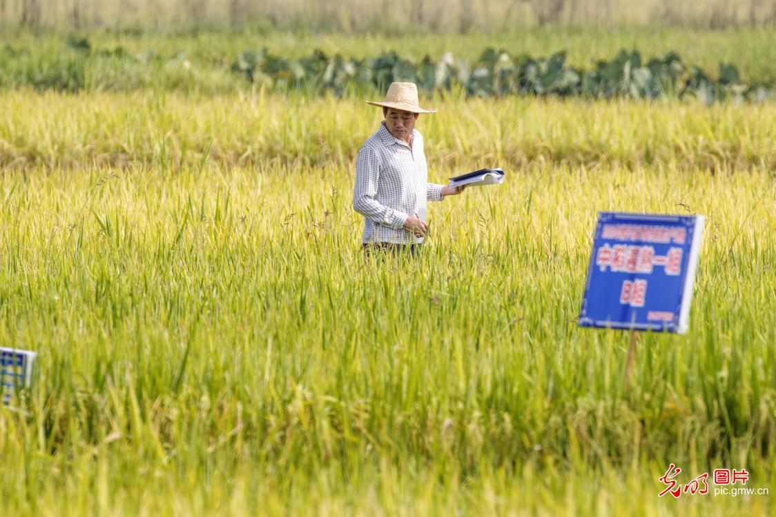 2020年9月1日,科技人员在湖南省湘西土家族苗族自治州龙山县石羔街道干比社区试验田里观察和记录水稻成熟期的生长状况。这次进行的水稻栽种试验是武陵山区(国家)水稻新品种区域及生产试验、湖南省主要农作物(中稻)区域试验、湖南杂交水稻研究中心水稻新品种品比试验等试验,属湖南省水稻省级品种区域试验,约300个水稻品种。(曾祥辉摄/光明图片)