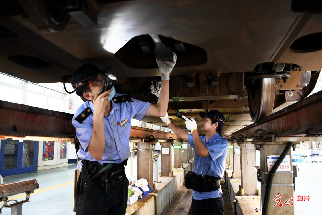 2020年9月1日,成都动车段职工正在对动车组开展秋季整修工作。自当日起,成都动车段对141组动车开展秋季整修工作,消除故障隐患,确保运行安全和旅客乘车环境舒适。(胡志强摄/光明图片)