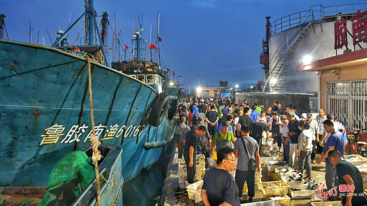 2020年9月2日,山东省青岛市西海岸新区积米崖港区出海捕捞的渔船回航,带回黄海首批鱼获。图为凌晨热闹的码头。(李亮摄/光明图片)