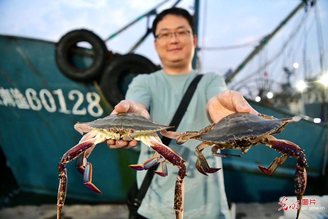 2020年9月2日,山东省青岛市西海岸新区积米崖港区出海捕捞的渔船回航,带回黄海首批鱼获。图为船员展示收获的大螃蟹。(李亮摄/光明图片)