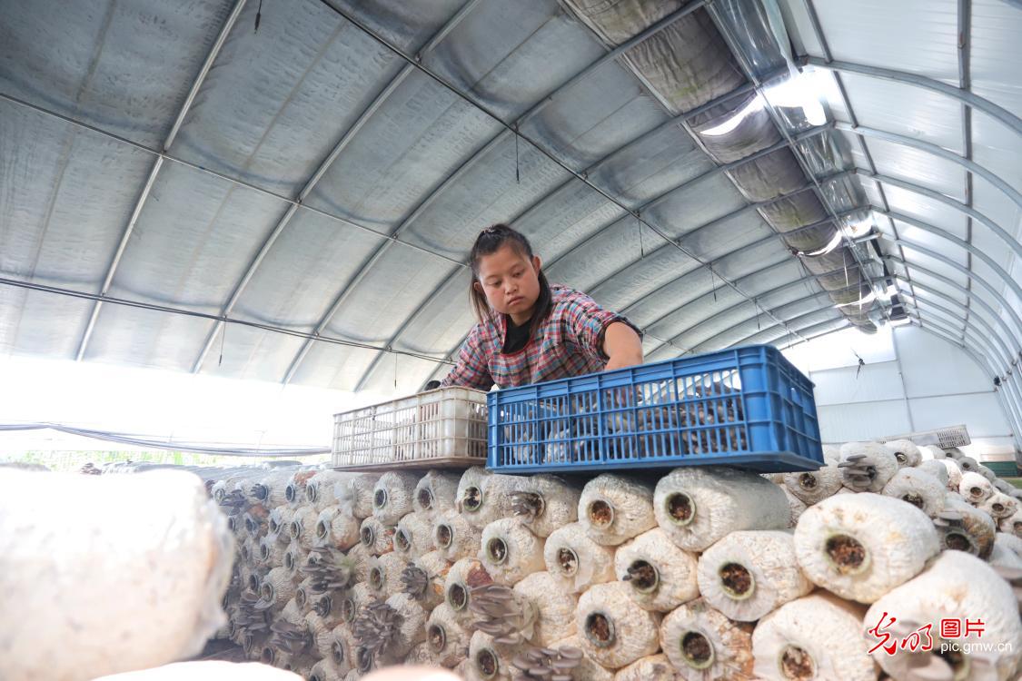 2020年9月1日,村民在日光温室蔬菜大棚里将收获的平菇整理装箱。甘肃省平凉市崆峒区按照"公司+基地+农户+互联网"、"合作社+种植户"等运作模式,建设了设施蔬菜标准化生产园区和产业基地,保障城乡居民生活的同时,也撑起了农民的"钱袋子"。(吴希会摄/光明图片)