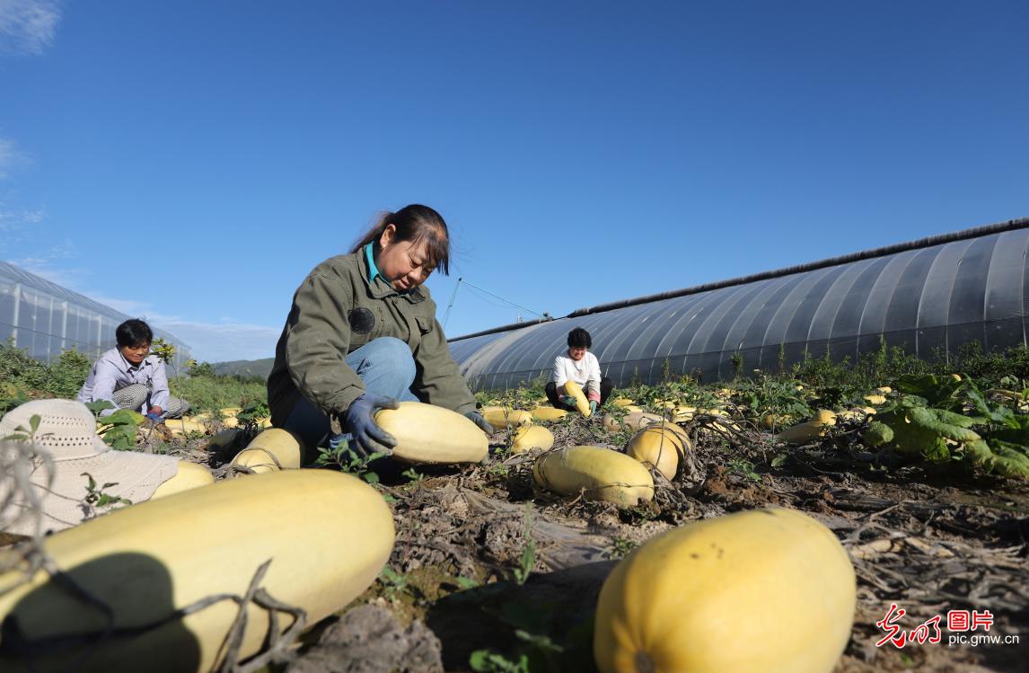 2020年9月1日,村民在鲜花种植基地里采摘籽瓜。甘肃省平凉市崆峒区按照"公司+基地+农户+互联网"、"合作社+种植户"等运作模式,建设了设施蔬菜标准化生产园区和产业基地,保障城乡居民生活的同时,也撑起了农民的"钱袋子"。(吴希会摄/光明图片)