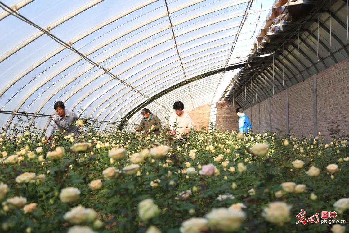 2020年9月1日,村民在鲜花种植基地里劳作。甘肃省平凉市崆峒区按照"公司+基地+农户+互联网"、"合作社+种植户"等运作模式,建设了设施蔬菜标准化生产园区和产业基地,保障城乡居民生活的同时,也撑起了农民的"钱袋子"。(吴希会摄/光明图片)