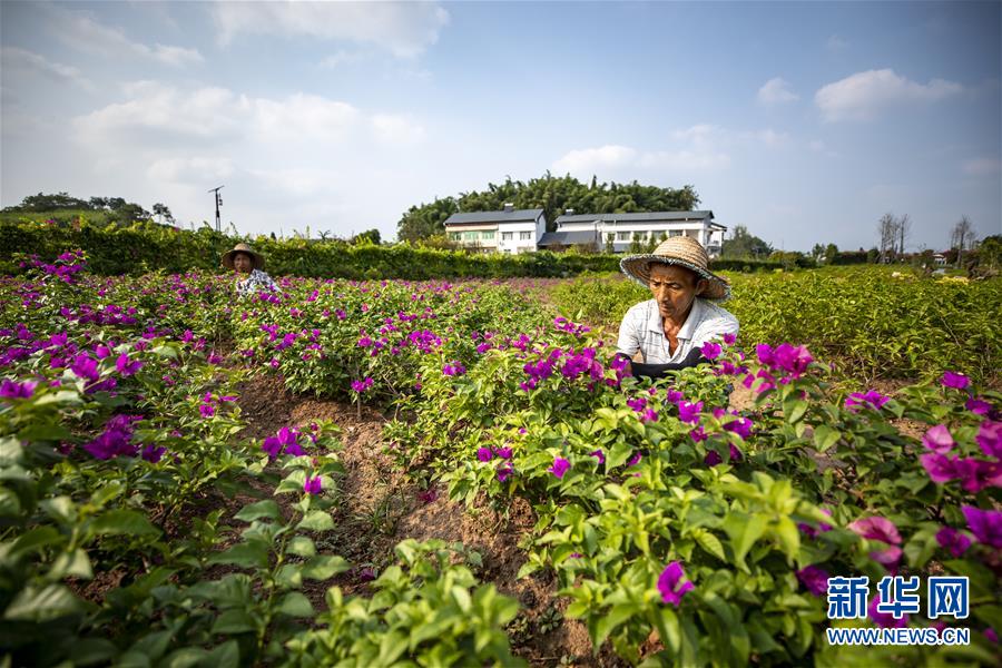 9月1日,在重庆市铜梁区巴川街道,八一社区村民谢有金在西郊绿道旁的三角梅基地科普园劳作。 近年来,重庆市铜梁区通过改善基础设施、提升人居环境、完善产业业态等方式促进乡村发展,打通一条集产业发展、观光旅游、便民惠民的西郊绿道,串联起沿线5个街镇,让30余个产业基地连线发展,助推农民增收和乡村振兴。 新华社记者 黄伟 摄