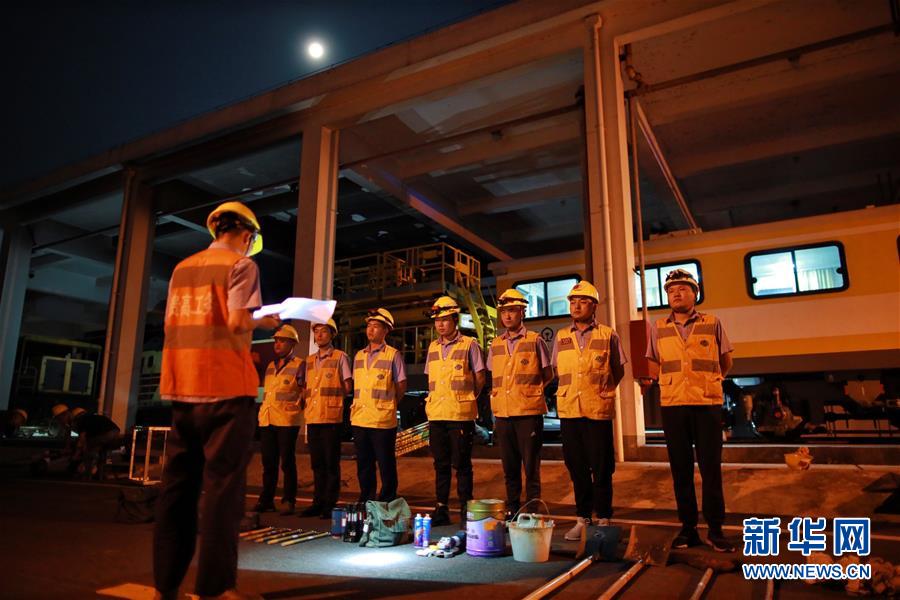 9月2日,贵阳高铁工务段职工在维修作业前开班前会。 贵阳高铁工务段管内高速铁路桥隧比超过80%,并且大部分隧道穿越喀斯特地貌不良地质,在集中降雨作用下,易诱发隧道漏水、边坡溜坍等水害。2020年汛期以来的很多夜晚,贵阳高铁工务段利用超声波检测车、三平台作业车等高科技手段对各类隧道病害隐患进行整治,大幅度提高了工作效率,确保了高铁安全。截至目前,该段已经完成排查隧道454座,发现问题并整治132个。 新华社记者 刘续 摄
