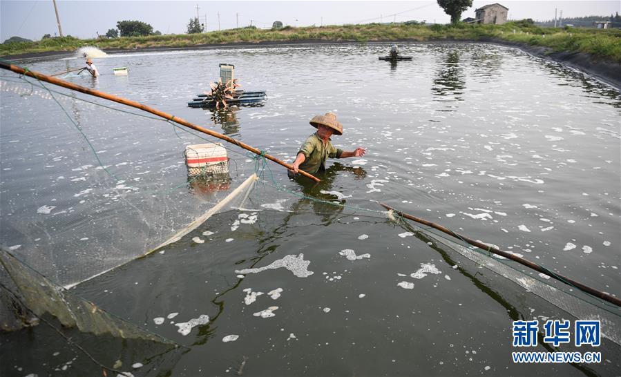 在广东省徐闻县和安镇北莉岛,村民在虾塘捕虾(9月2日摄)。 广东省徐闻县和安镇北莉岛到了虾苗成熟的时节,村民们在虾塘忙碌,收获满满。 新华社记者 邓华 摄