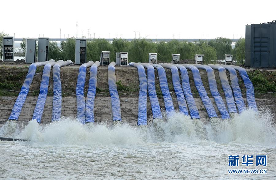 在十八联圩生态湿地蓄洪区,临时应急排涝站开机排涝(9月3日摄)。 新华社记者 韩晓雨 摄