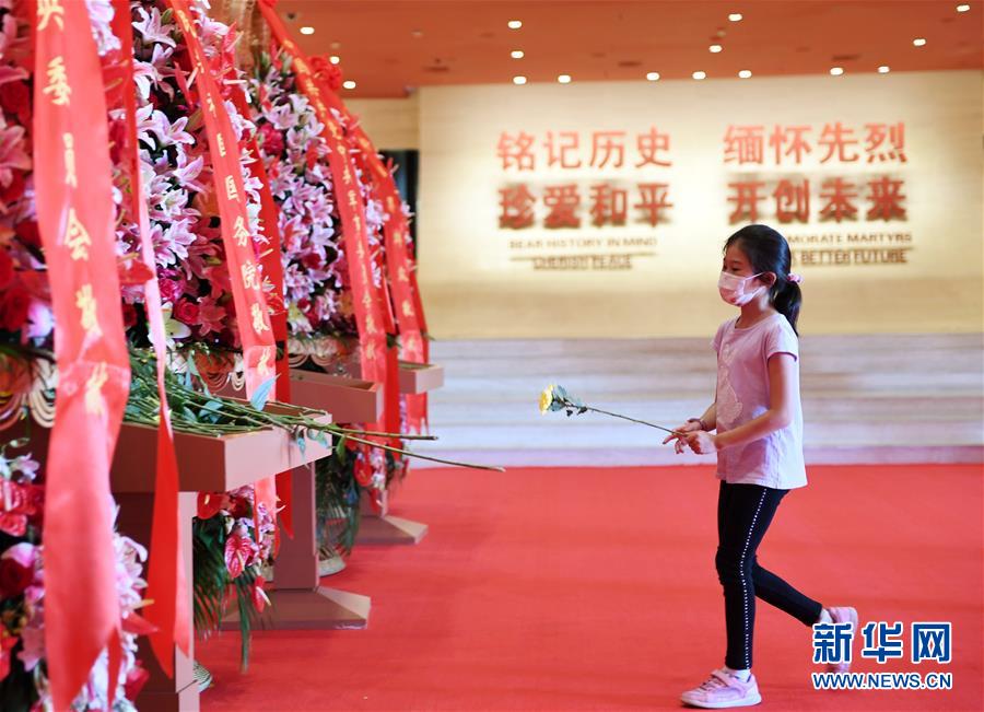 9月3日,前来参观的小朋友向抗战英烈敬献鲜花。 当日是中国人民抗日战争暨世界反法西斯战争胜利75周年纪念日,许多市民来到中国人民抗日战争纪念馆参观,铭记历史,缅怀先烈。 新华社记者 张晨霖 摄