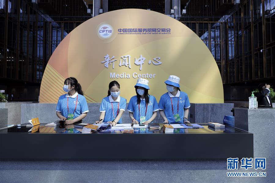 9月3日,志愿者在2020服贸会新闻中心咨询台工作。新华社记者李木子摄