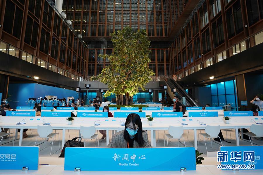9月3日,记者在2020服贸会新闻中心内工作。新华社记者鞠焕宗摄