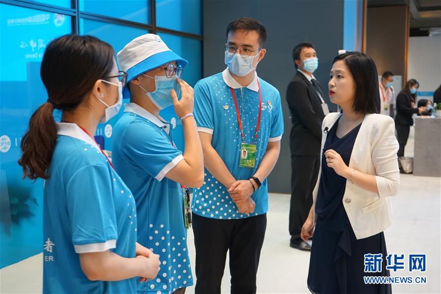 9月3日,志愿者在2020服贸会新闻中心内同记者交谈。新华社记者郑悦摄