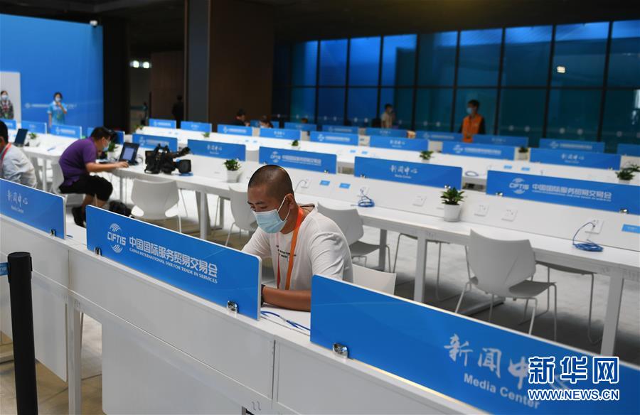 9月3日,记者在2020服贸会新闻中心内工作。新华社记者鲁鹏摄