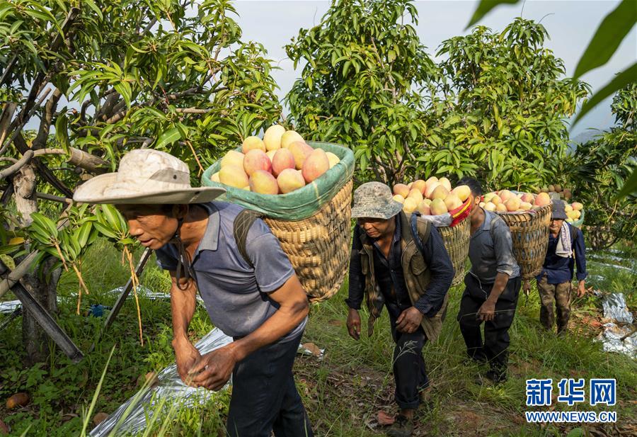 9月4日,果农在华坪县荣将镇龙头村果子山上背运刚采摘的芒果。初秋时节,云南省丽江市华坪县种植的晚熟芒果成熟,果农们采摘、装运芒果,一派忙碌景象。近年来,华坪县因地制宜大力发展芒果产业,目前全县芒果种植面积达37.8万余亩。2019年,该县芒果产量达到31万余吨,带动当地群众脱贫致富。新华社发(陈欣波 摄)