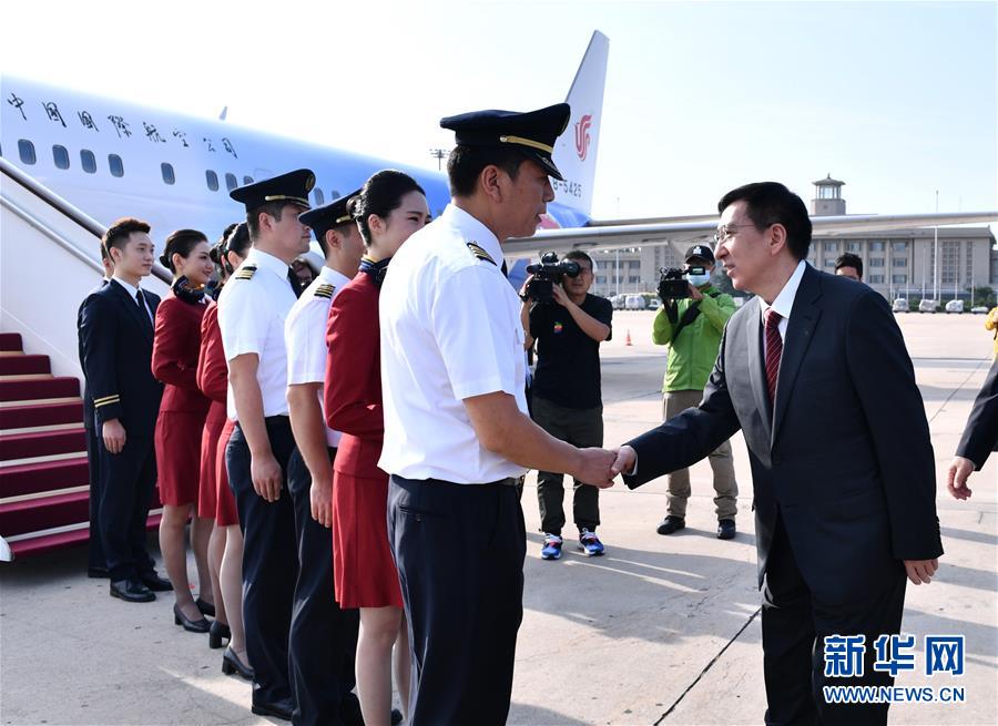 9月5日,北京市副市长、北京冬奥组委执行副主席张建东(右一)为“冬奥冰雪号”彩绘飞机首航机组人员送行。新华社记者贺长山摄