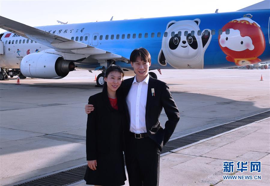 9月5日,花样滑冰世界冠军庞清/佟健(右)在“冬奥冰雪号”彩绘飞机前合影留念。新华社记者贺长山摄