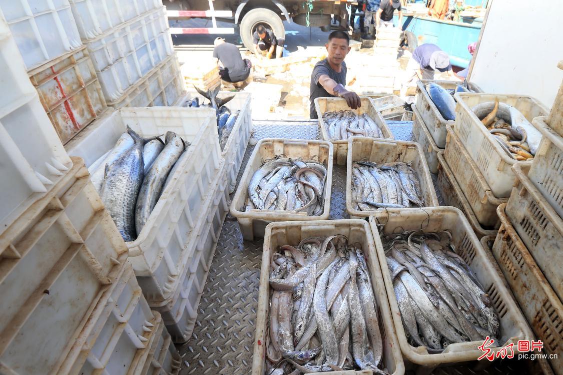 2020年9月4日,山东省荣成市成山镇一渔港,开渔后首批归来的渔船正靠港卸鱼,捕捞的鱼货品种主要以鲅鱼、带鱼和鳀鱼为主,船东、鱼货商和喜吃海鲜赶来的市民齐聚码头,各类载货车辆往来穿梭,一派繁忙。(王福东摄/光明图片)