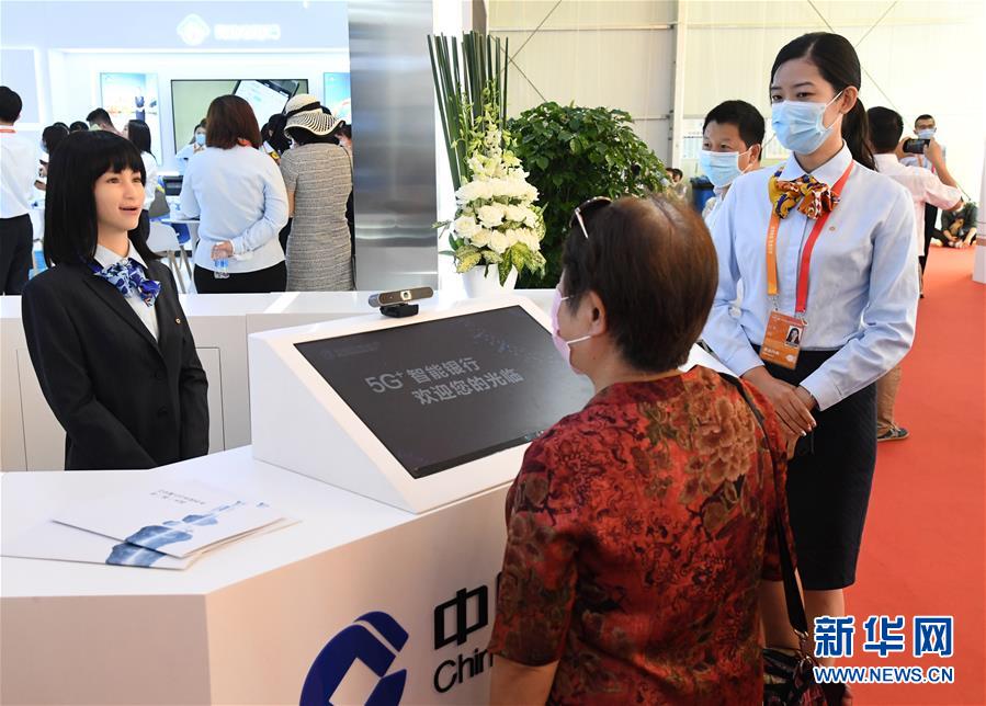 9月5日,在2020年中国国际服务贸易交易会金融服务专题展区,参观者(右前)与银行仿真机器人大堂经理(左一)交流。 2020年中国国际服务贸易交易会于9月4日至9日在北京举行。 新华社记者 任超 摄