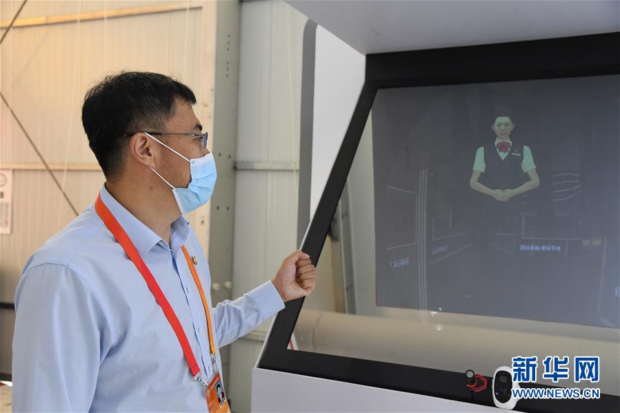 9月5日,在2020年中国国际服务贸易交易会金融服务专题展区,工作人员展示银行虚拟3D迎宾。 2020年中国国际服务贸易交易会于9月4日至9日在北京举行。 新华社记者 任超 摄