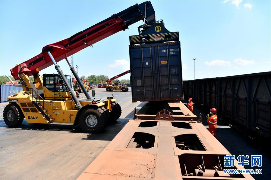 9月4日,在阜六铁路吴集站货场,工作人员在装卸集装箱。新华社记者 刘军喜 摄