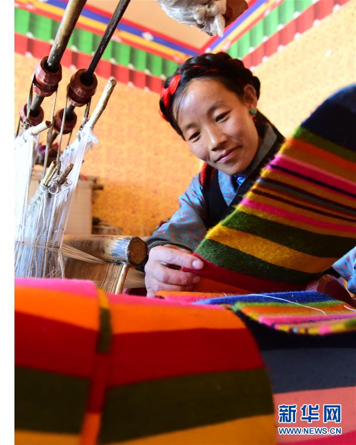 郭加新村村民尼片在编织藏式围裙(9月4日摄)。 新华社发(索朗罗布 摄)