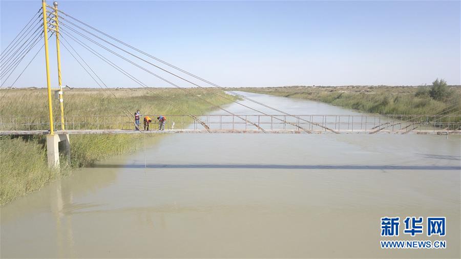 9月5日,水利工作者在大西海子水库对输往塔里木河下游的生态水量进行监测(无人机照片)。新华社发(肖玉磊 摄)