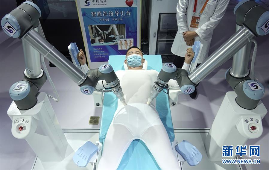 9月5日,在服贸会综合展区中科尚易展台,工作人员展示使用智能经络导引台。 新华社记者 才扬 摄