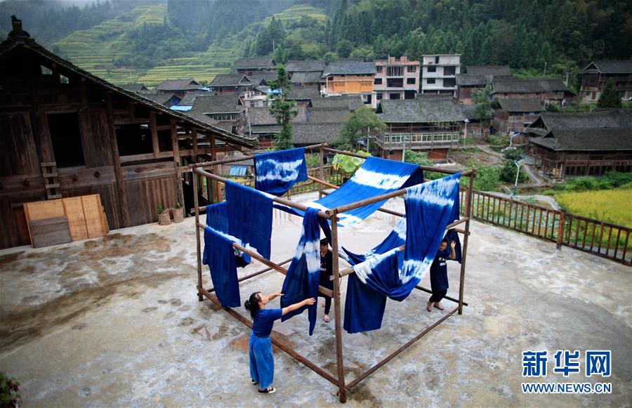 当地妇女在晾晒布匹(9月6日摄)。 秋日时节,贵州省榕江县栽麻镇丰登侗寨的少数民族妇女利用有利天气条件,采集原料、织布、染布、晒布,精心制作具有民族特色的侗布。 新华社记者 刘续 摄