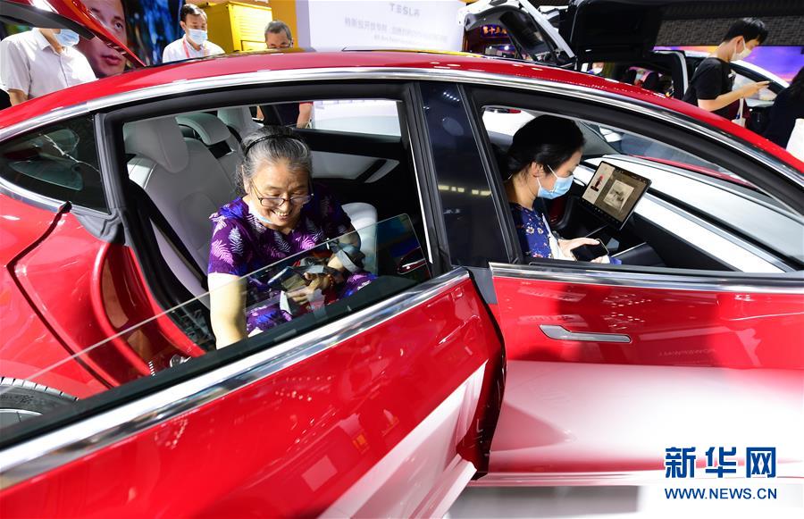 9月7日,观众在服贸会综合展区体验特斯拉新能源汽车。 2020年中国国际服务贸易交易会9月4日至9日在北京举行。 新华社记者 尹栋逊 摄