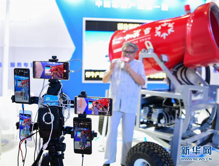 9月7日,一名男子在服贸会综合展区进行多渠道网络直播。 2020年中国国际服务贸易交易会9月4日至9日在北京举行。 新华社记者 尹栋逊 摄