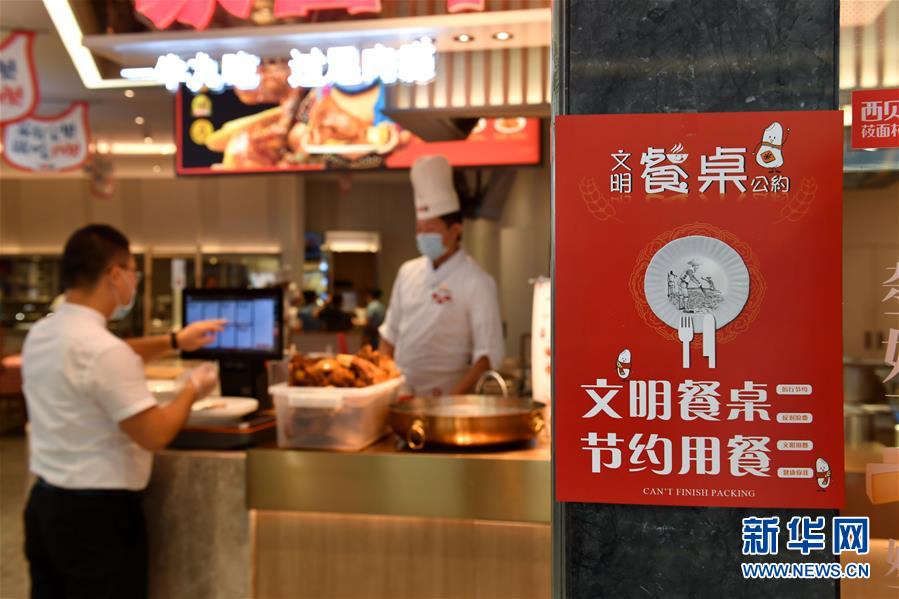 9月7日拍摄的位于呼和浩特市振华广场一家商户门口的宣传标语。 近日,内蒙古自治区呼和浩特市加强“厉行节约、反对浪费”宣传,采取多项措施倡导大众节约用餐。 新华社记者 贝赫 摄