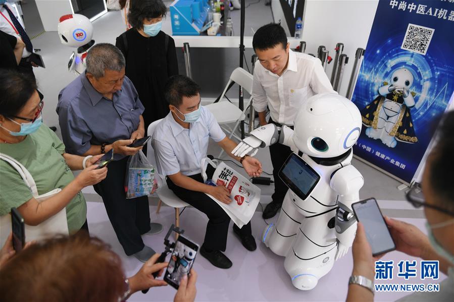 9月7日,在服贸会服务机器人专题展区,观众体验中医AI机器人把脉。 这家企业的中医AI机器人可通过中医诊断方式与人交互,并提供体质检测、健康咨询等服务。 新华社记者 才扬 摄