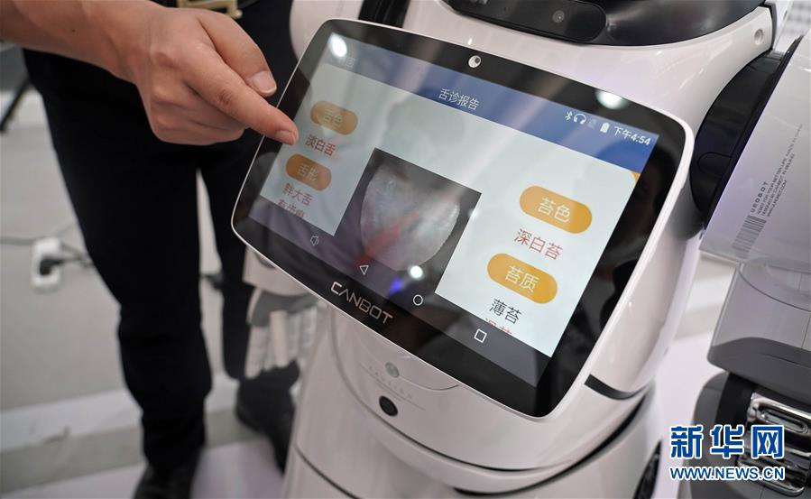 9月7日,在服贸会服务机器人专题展区,一款中医AI机器人为观众看舌苔后生成报告。 这家企业的中医AI机器人可通过中医诊断方式与人交互,并提供体质检测、健康咨询等服务。 新华社记者 才扬 摄
