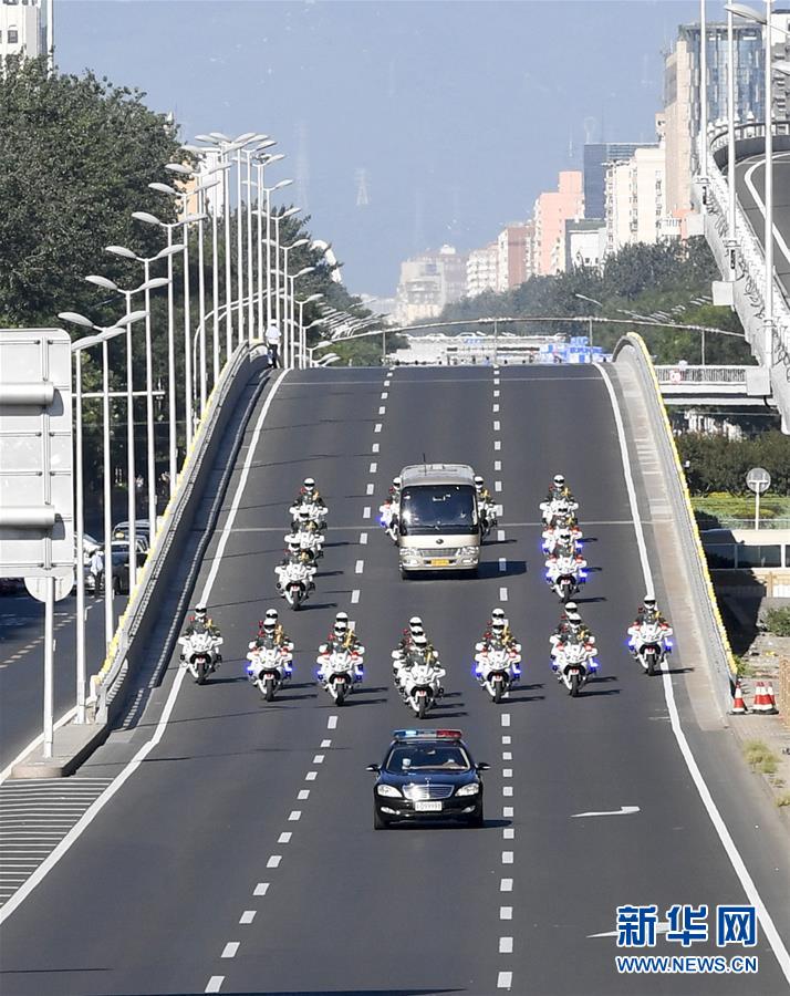 9月8日上午,国家勋章和国家荣誉称号获得者乘坐礼宾车从住地出发,在国宾护卫队的护卫下,前往人民大会堂。 全国抗击新冠肺炎疫情表彰大会将于9月8日上午10时在北京人民大会堂隆重举行。 新华社记者 高洁 摄