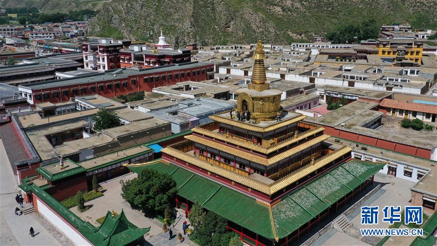 这是位于甘南藏族自治州夏河县的拉卜楞寺贡唐宝塔(9月1日摄,无人机照片)。 新华社记者 陈斌 摄